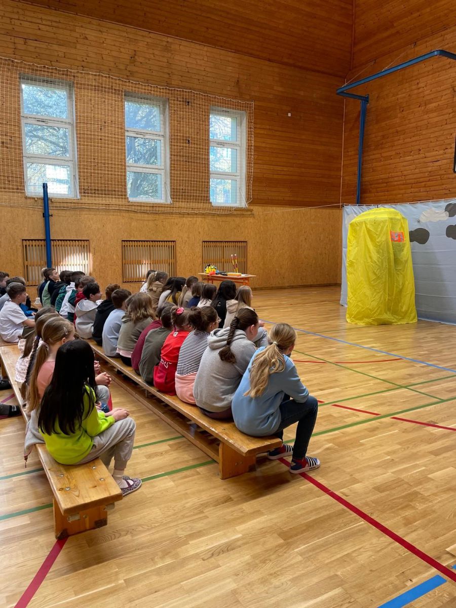 7. dubna hostovalo v naší tělocvičně divadlo čistě v angličtině, kdy se diváci přímo aktivně účastnili děje a řešili napínavou zápletku. Bez pochopení textu se neobešli a děj by ani nemohl pokračovat. Někdo rozuměl hned, někdo po chvilce. Děti si ověřily, že umět se domluvit cizím jazykem je báječná věc. Kolik řečí umíš, tolikrát jsi Jitřňákem.