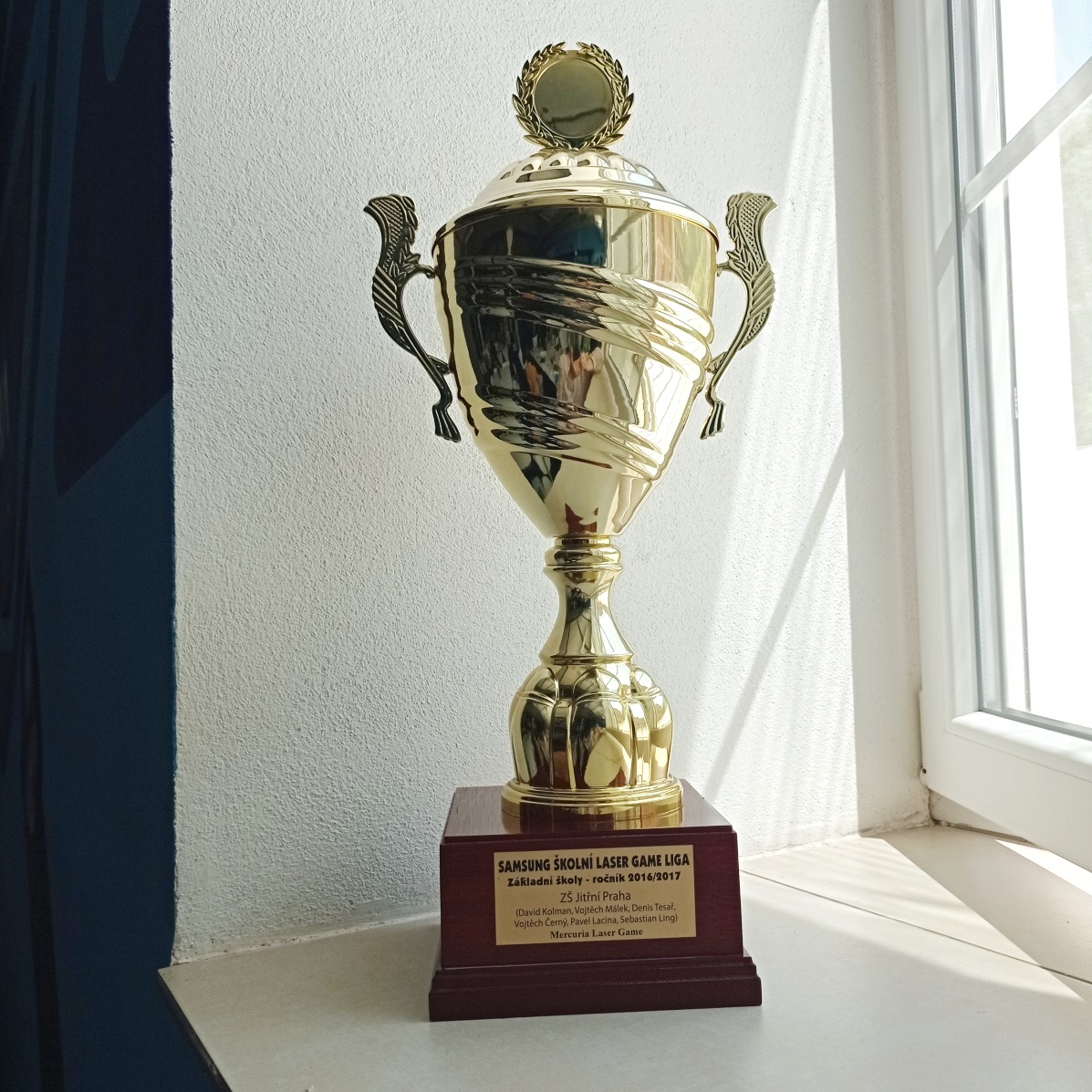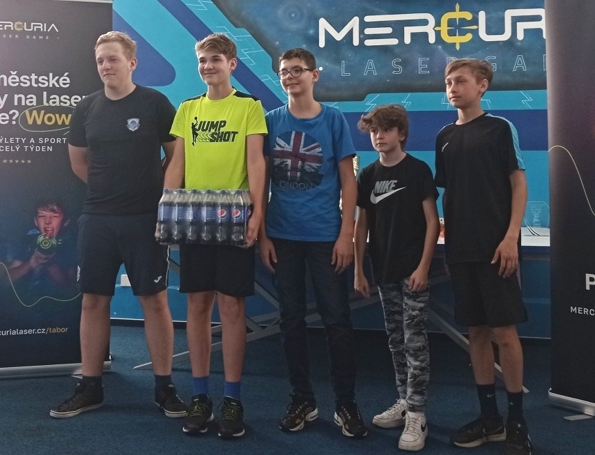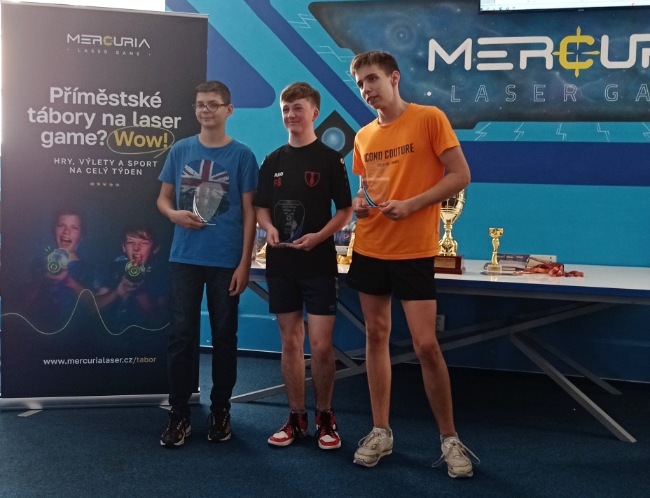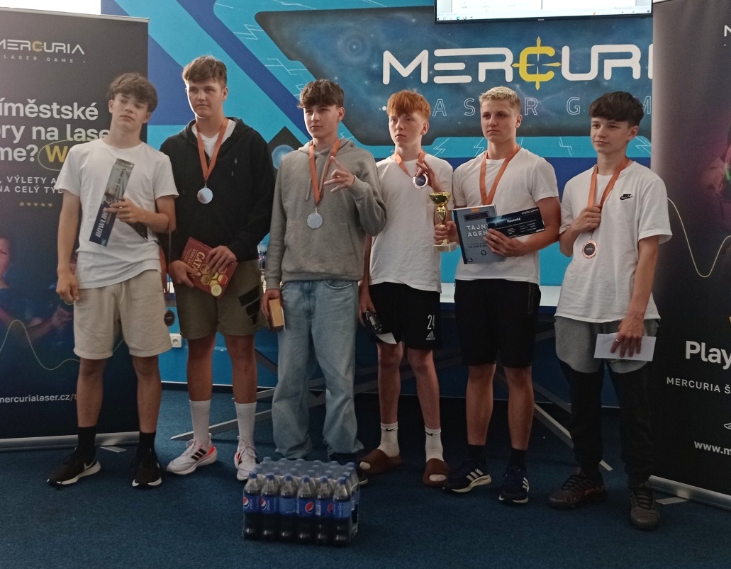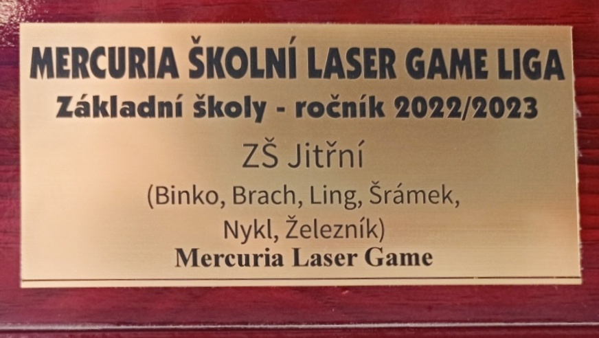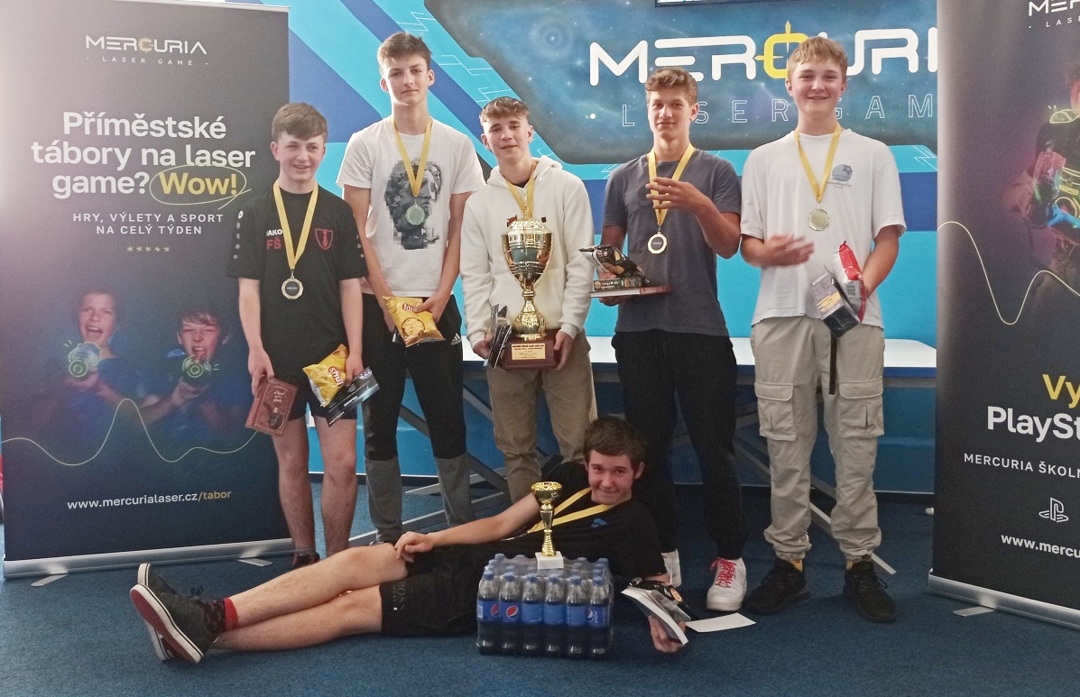 Tradiční každoroční turnaj v laser game letos dopadl mimořádně dobře! Tým našich deváťáků získal pro školu putovní pohár za absolutní vítězství! Další tým deváťáků byl na 3. místě a tým sedmáků na 4. Další naše týmy (celkem jich do finále postoupilo 6) se také umístily moc hezky. Žák Šrámek byl druhým nejlepším střelcem turnaje a žák Jahn 3. nejlepším. Kluci a holky, děkujeme za skvělou reprezentaci školy!!! Více fotek najdete zde: