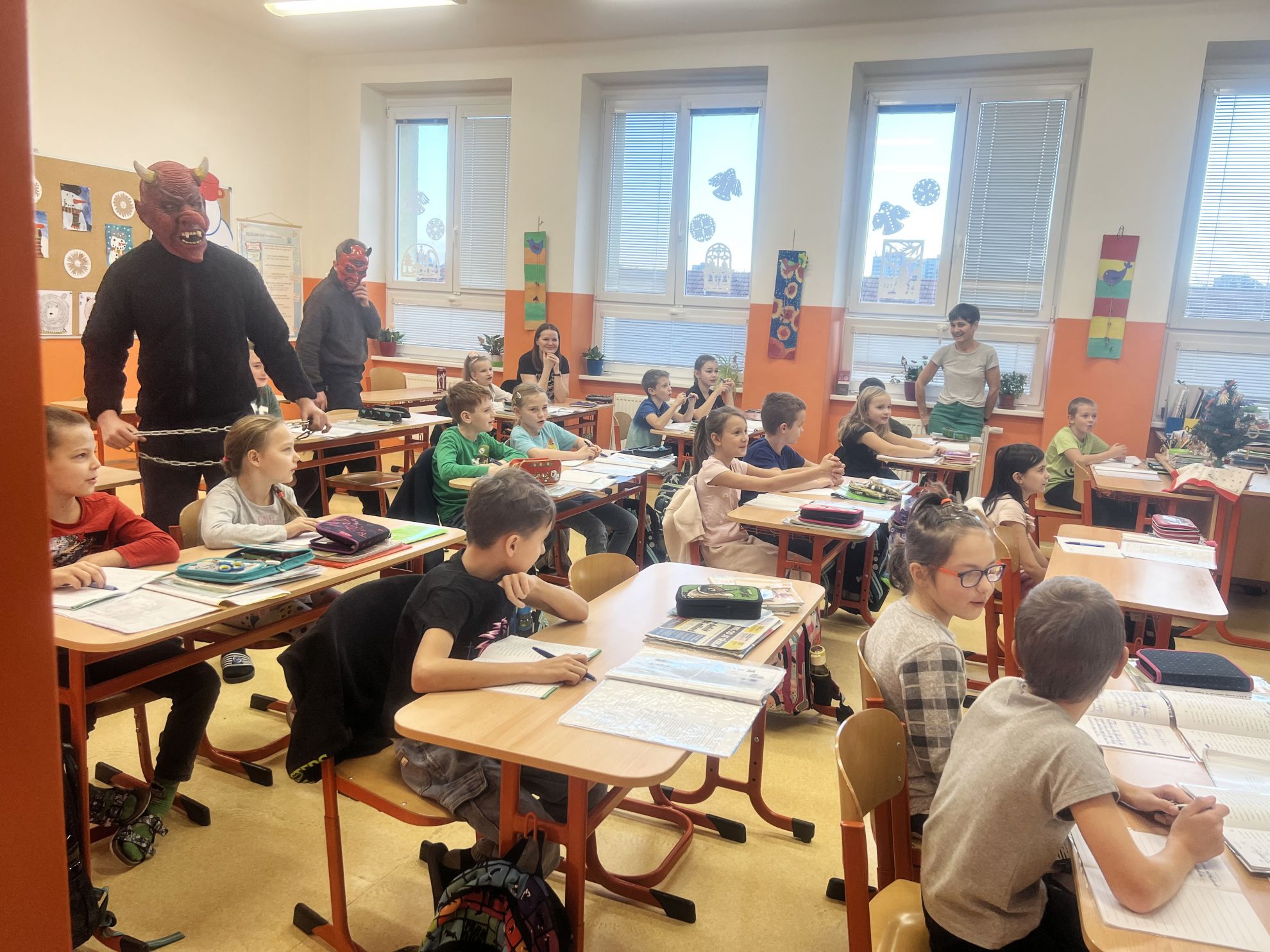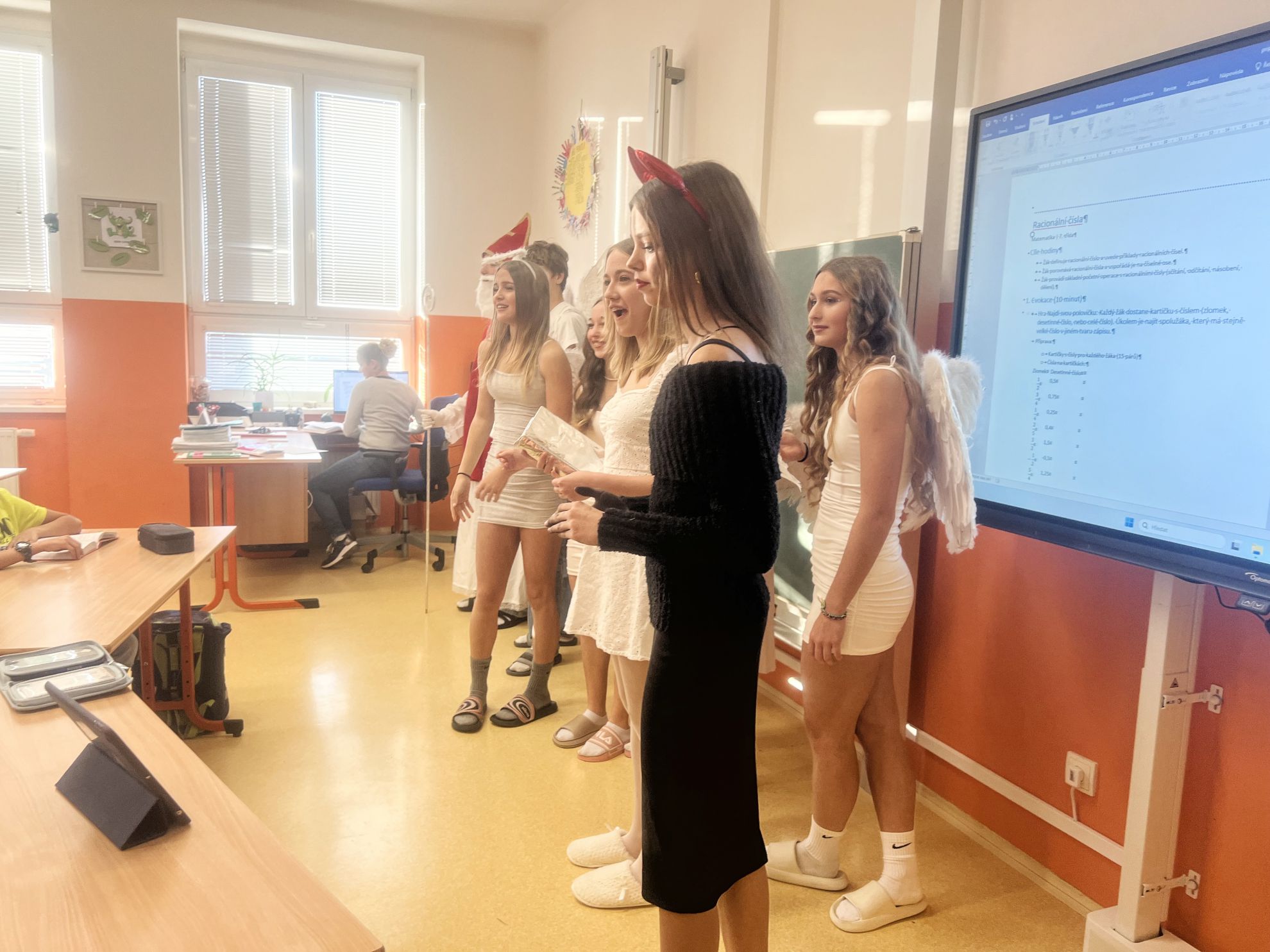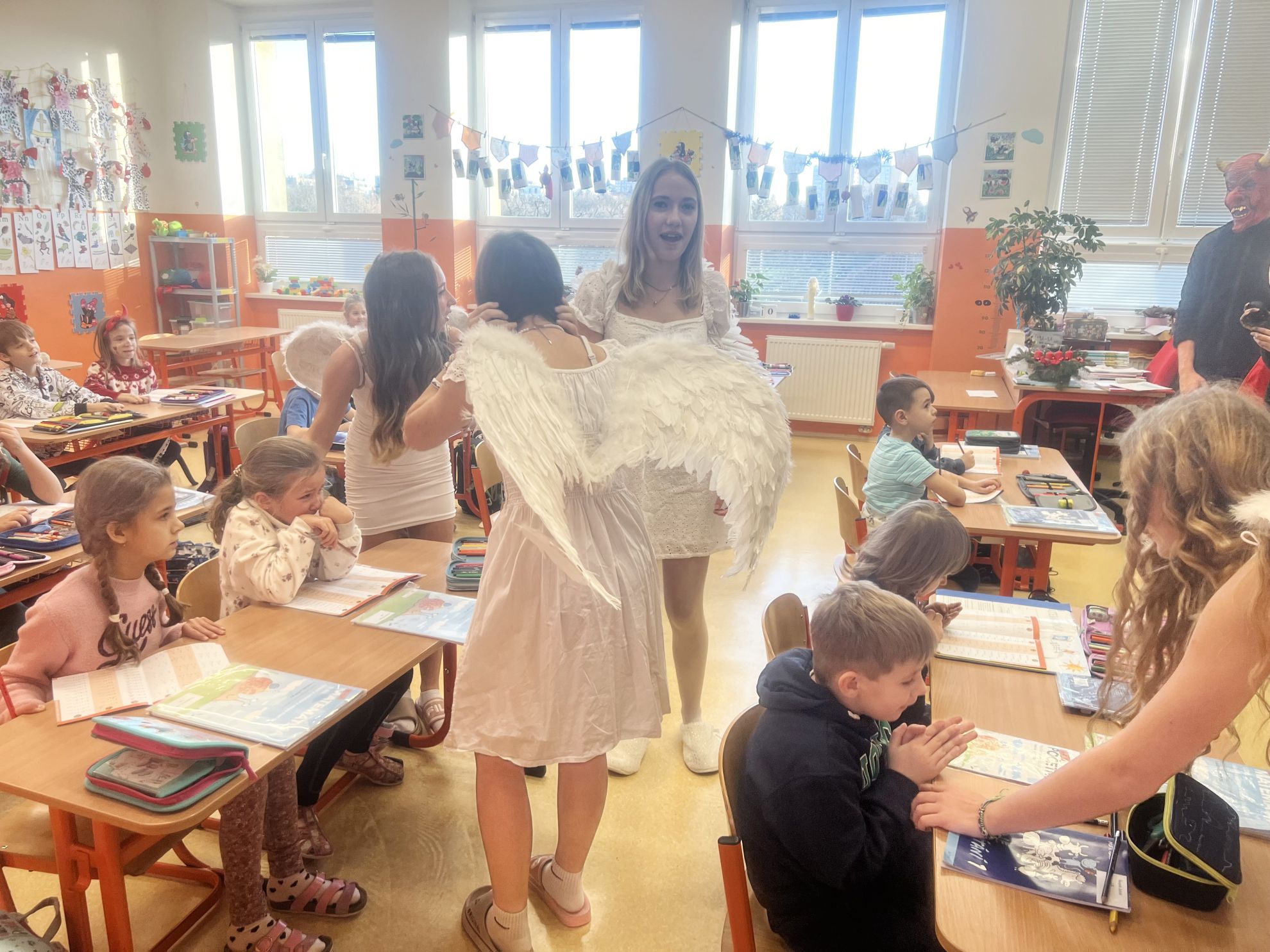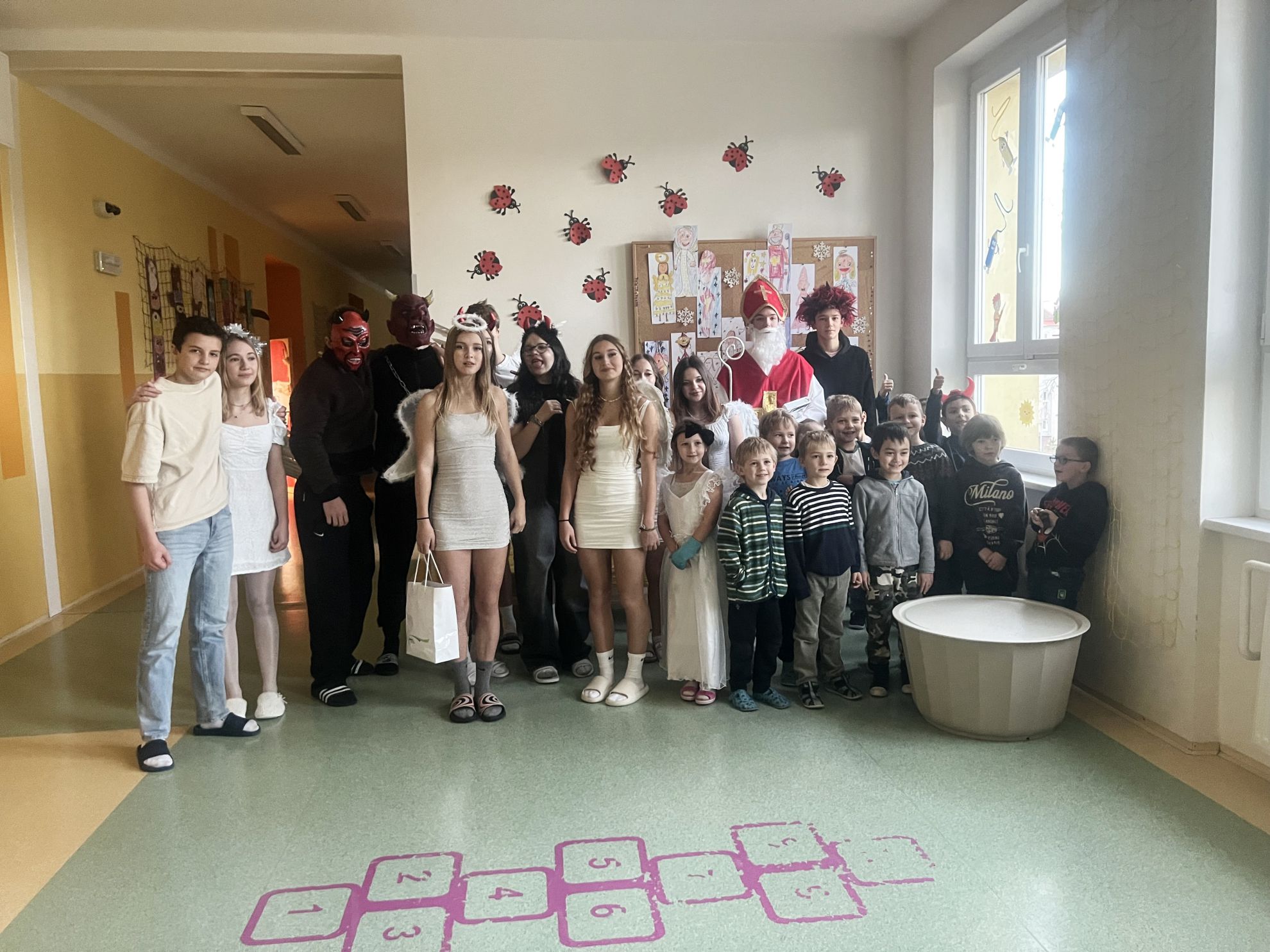 Početná družina čertů a andělů v čele se svatým Mikulášem navštívila naše žáky. Někteří se trošku obávali, zda nebudou muset obhajovat své skutky, ale většina uvítala nebesko-pekelnou delegaci radostně. Dobrotivost andělů i spravedlivý hněv čertů byly v rovnováze, Mikuláš dohlížel na spravedlivé rozdělení dobrot. Zajímavé je, že někteří čerti a někteří andělé jakoby připomínali žáky a žákyně 9.A. Ale to je čistá náhoda.