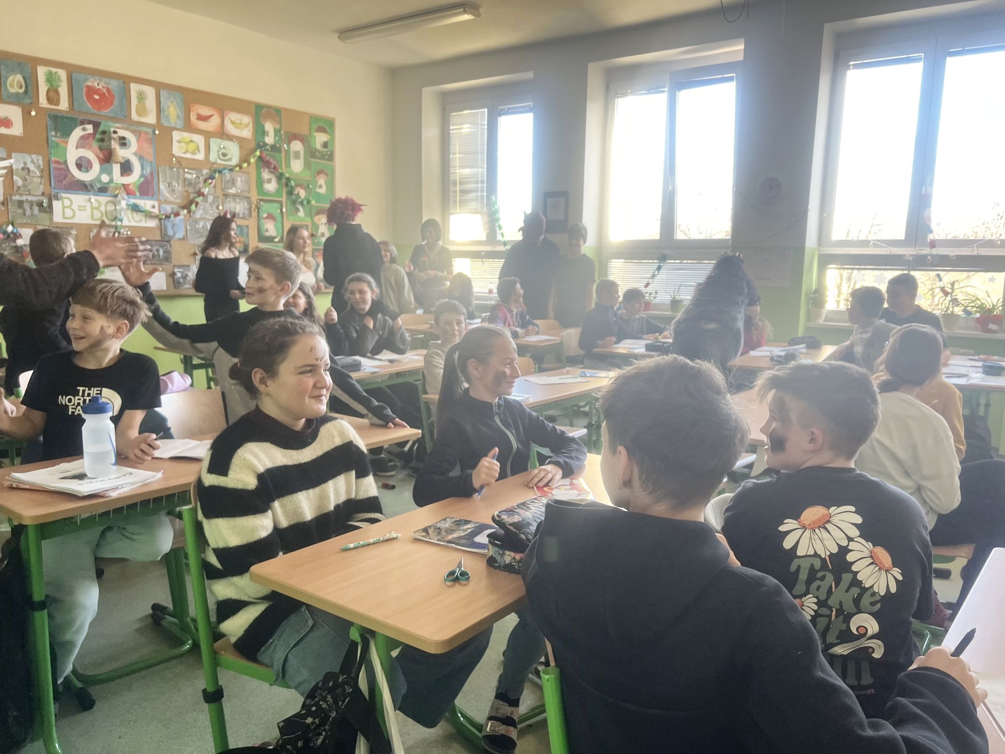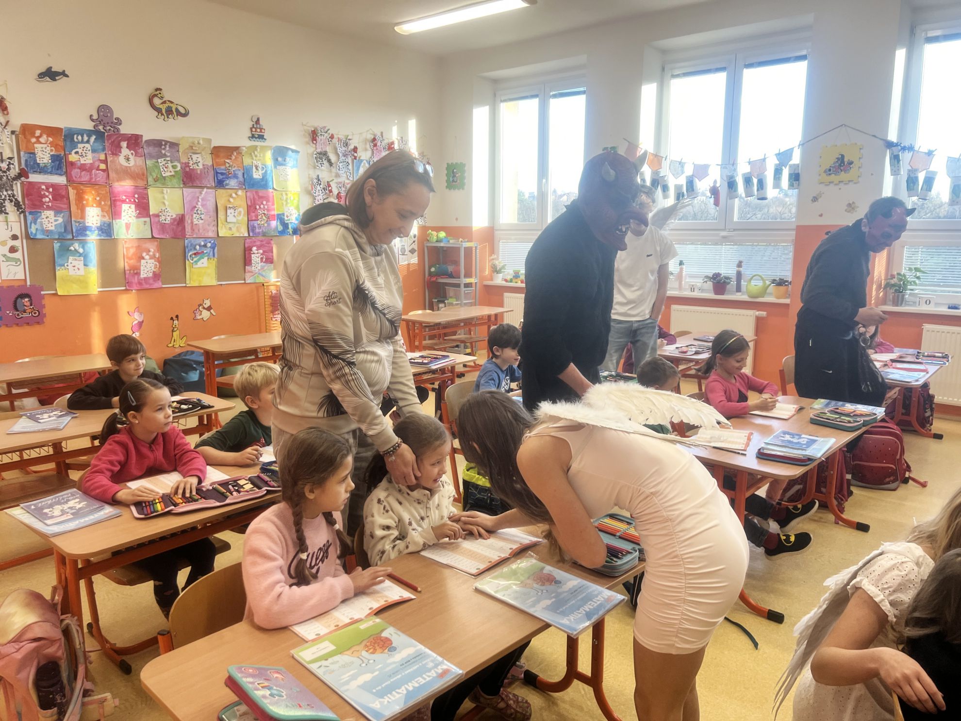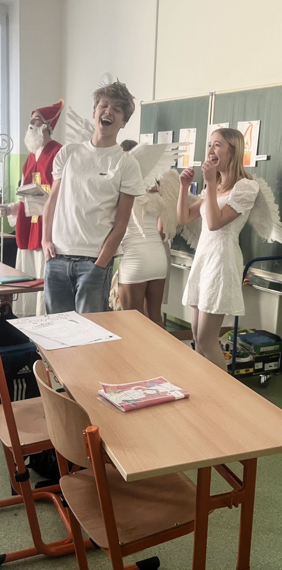 Početná družina čertů a andělů v čele se svatým Mikulášem navštívila naše žáky. Někteří se trošku obávali, zda nebudou muset obhajovat své skutky, ale většina uvítala nebesko-pekelnou delegaci radostně. Dobrotivost andělů i spravedlivý hněv čertů byly v rovnováze, Mikuláš dohlížel na spravedlivé rozdělení dobrot. Zajímavé je, že někteří čerti a někteří andělé jakoby připomínali žáky a žákyně 9.A. Ale to je čistá náhoda.