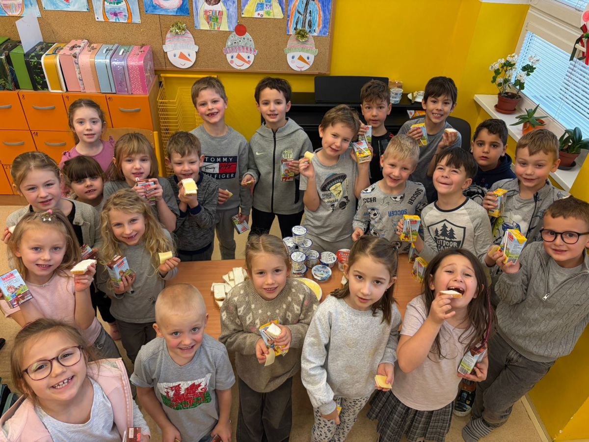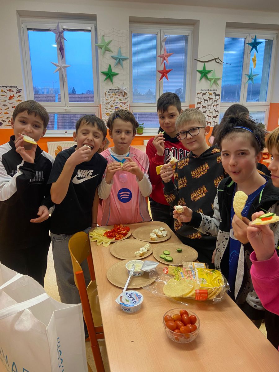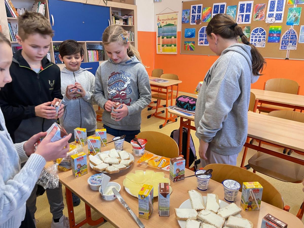Za pomoci laskavých paní asistentek si děti na 1. stupni připravily zdravé pohoštění z produktů projektu Mléko do škol.