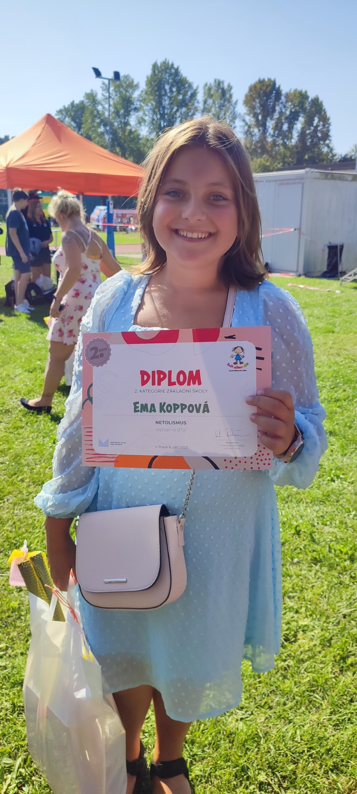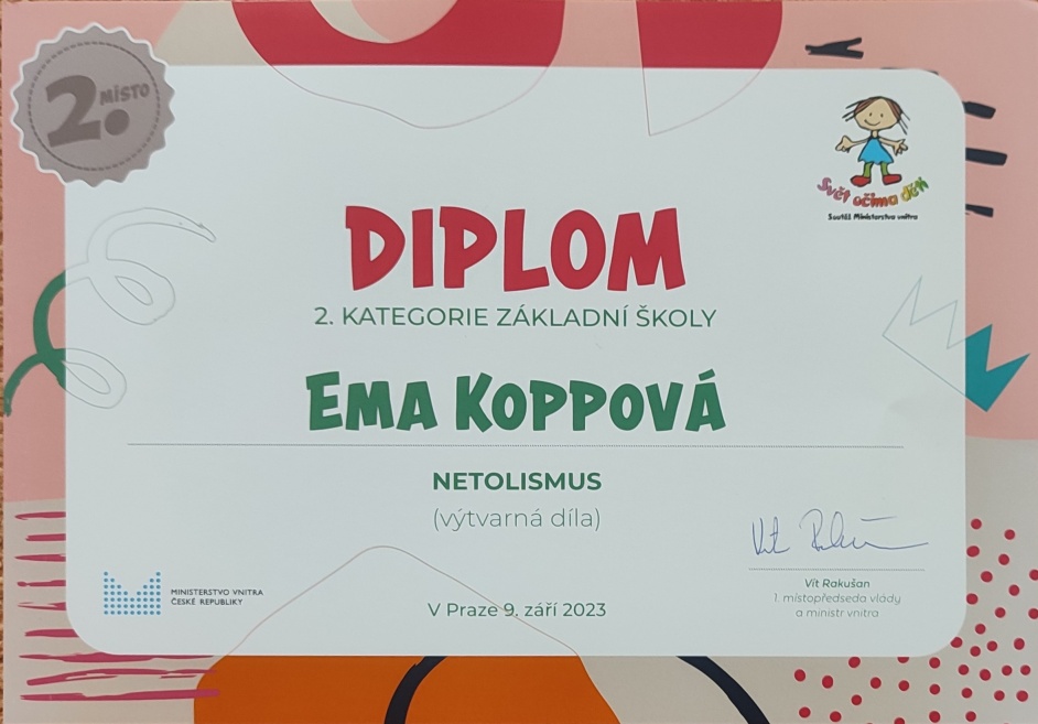 Poslyšte tu skvělou novinu: Ema Koppová, žákyně nynější 4.A získala 2. místo v celostátní výtvarné soutěži Svět očima dětí. Přihlášeno bylo neuvěřitelných 4587 prací. Do užšího klání bylo porotou Ministerstva vnitra, které soutěž organizovalo, vybráno asi 100 děl. Jak je vidět, naši žáci dokážou velké věci. Emo, moc ti gratulujeme a jsme na tebe pyšní! Pro ostatní žáky je to inspirace a potvrzení o tom, že se mohou směle podobných akcí účastnit.