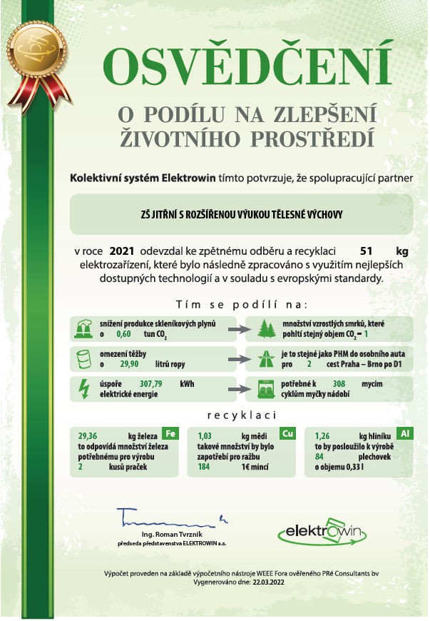 Díky svým obyvatelům se ZŠ Jitřní s rozšířenou výukou tělesné výchovy může v roce 2021 pochlubit sběrem starého elektra určeného ke zpětnému odběru a recyklaci o hmotnosti 0,05 t. Na každého obyvatele tak připadá kg vysloužilých spotřebičů. Byla tím uspořena spotřeba elektřiny a produkce skleníkových plynů, celosvětově omezena těžba ropy a železné rudy, a recyklací se pokryla i část dodávek mědi nebo hliníku pro průmyslovou výrobu.