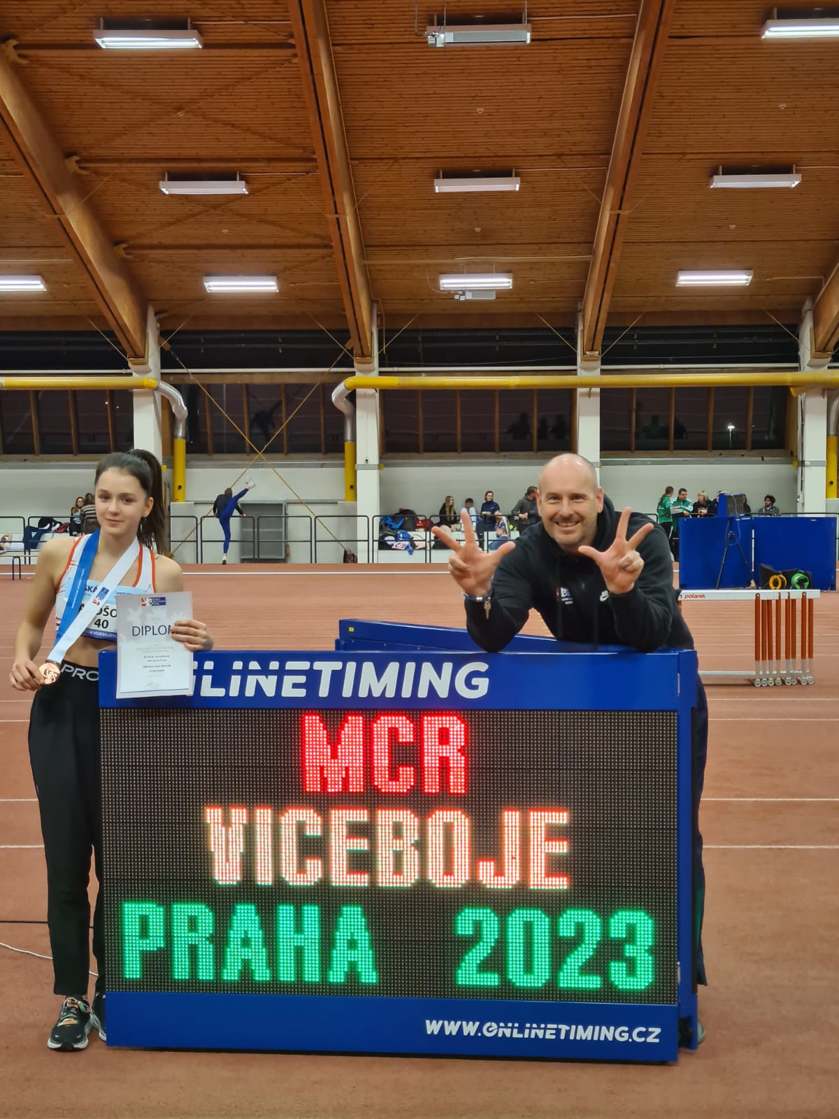 V pátek 10.2. 2023 se uskutečnilo ve Stromovce MČR žákyň v halovém pětiboji. Skvěle nás reprezentovala Eliška Jarošová, která po lednovém zisku přebornice Prahy patřila mezi favoritky soutěže. Bohužel hned v první disciplíně na 60 metrů s překážkami po kolizi s překážkou doběhla s velkou ztrátou poslední a boj o medaile se jevil jako utopie. Ve své parádní disciplíně výšce přeskočila 162 cm a po vítězství v kouli se přiblížila medailovým umístěním. Ve skoku dalekém předvedla svůj standardní výkon a protože i soupeřky něco pokazily, do závěrečné osmistovky vstupovala ze 4. místa. V ní dokázala i s obnoveným zraněním stehna neuvěřitelně zabojovat a o pár bodů se dostala na konečnou třetí příčku.