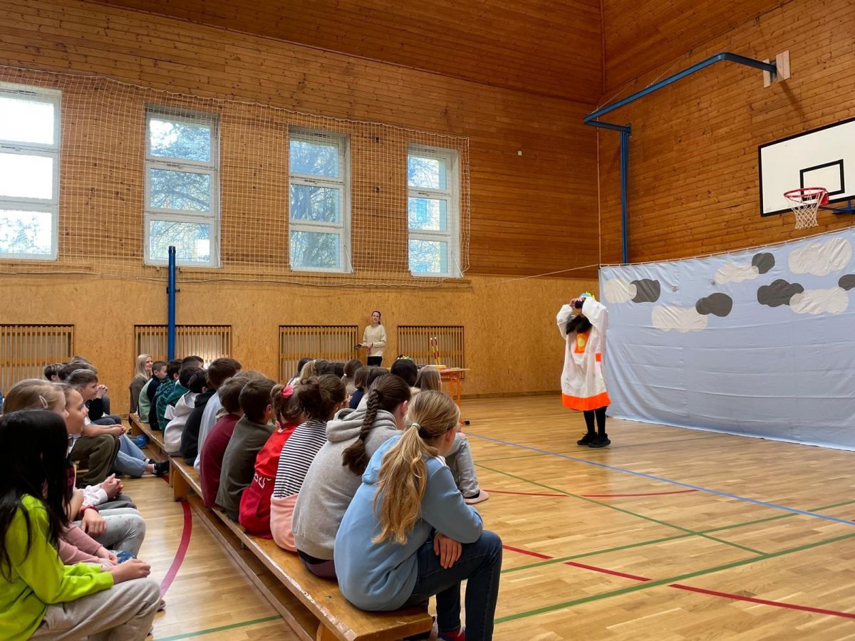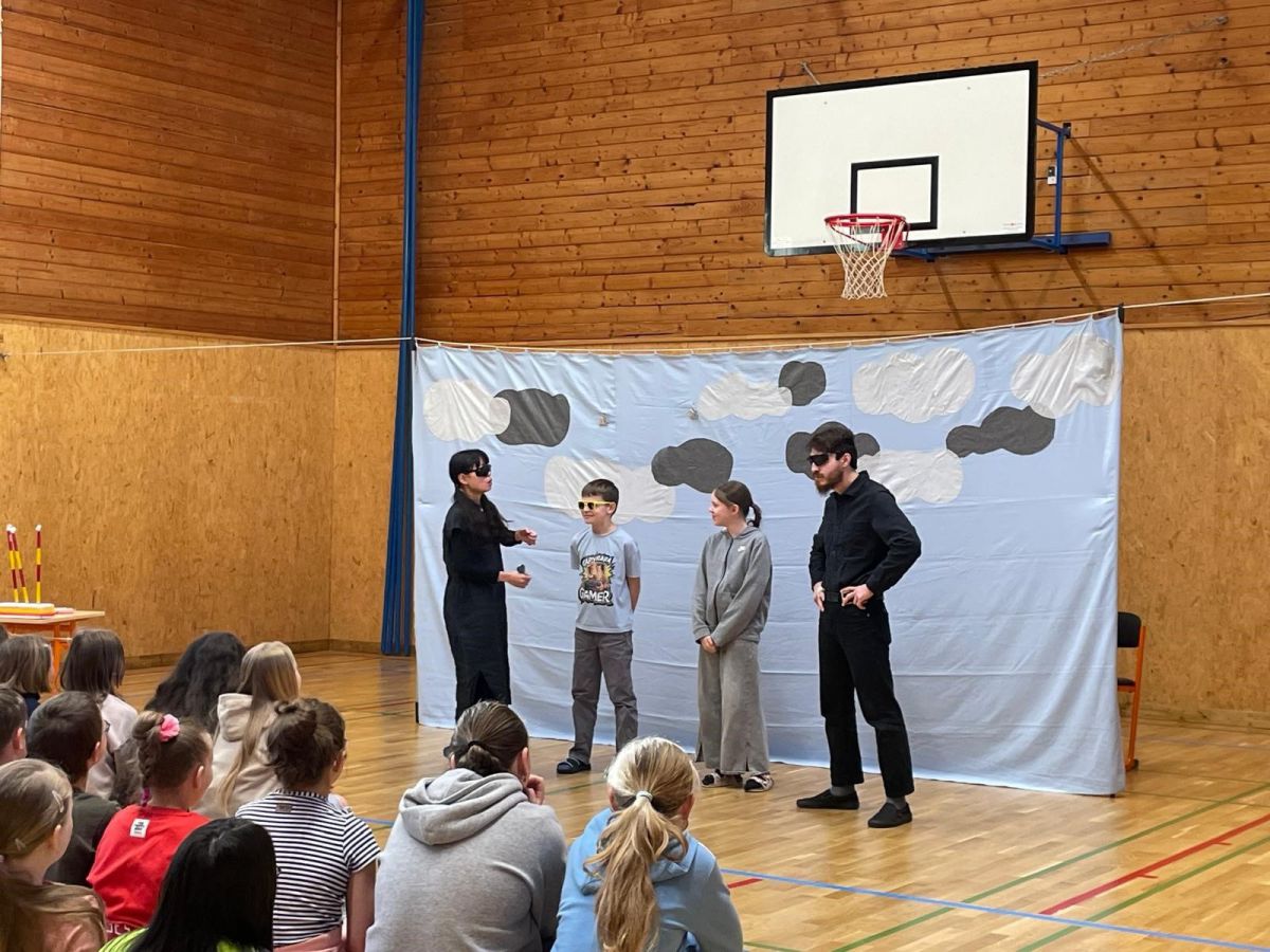 7. dubna hostovalo v naší tělocvičně divadlo čistě v angličtině, kdy se diváci přímo aktivně účastnili děje a řešili napínavou zápletku. Bez pochopení textu se neobešli a děj by ani nemohl pokračovat. Někdo rozuměl hned, někdo po chvilce. Děti si ověřily, že umět se domluvit cizím jazykem je báječná věc. Kolik řečí umíš, tolikrát jsi Jitřňákem.