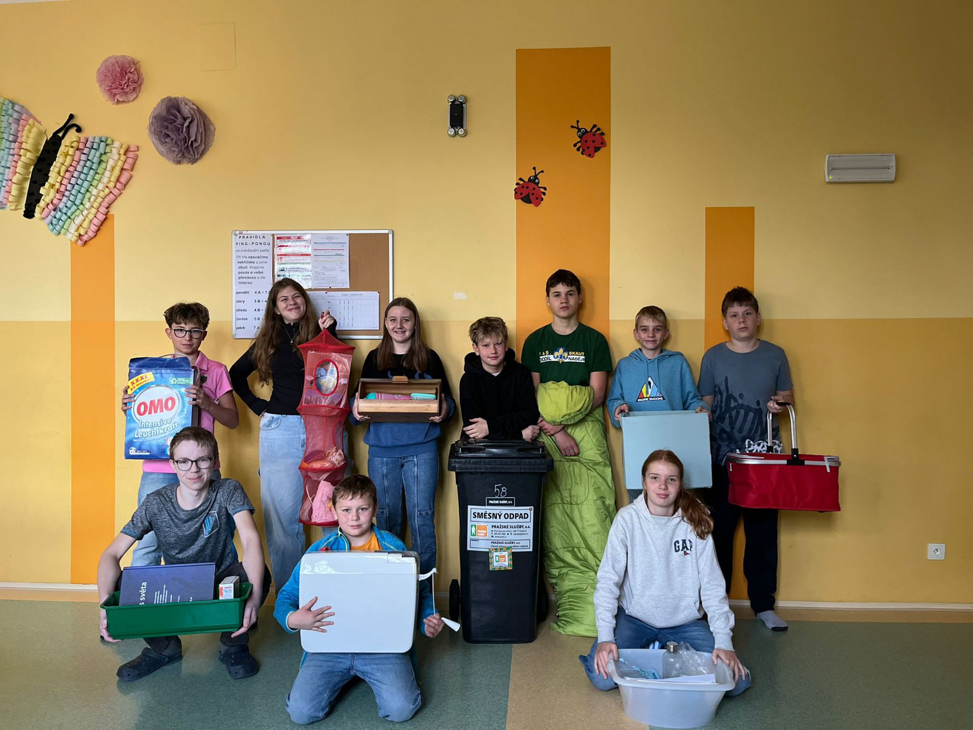 Popelnice, smotaný koberec, WC rezervoár, mikrovlnná trouba, chlebník, hrnce a tak dále. Naši žáci letos překvapili nápaditostí při pátečním Dni bez tašek. Více fotek zde: